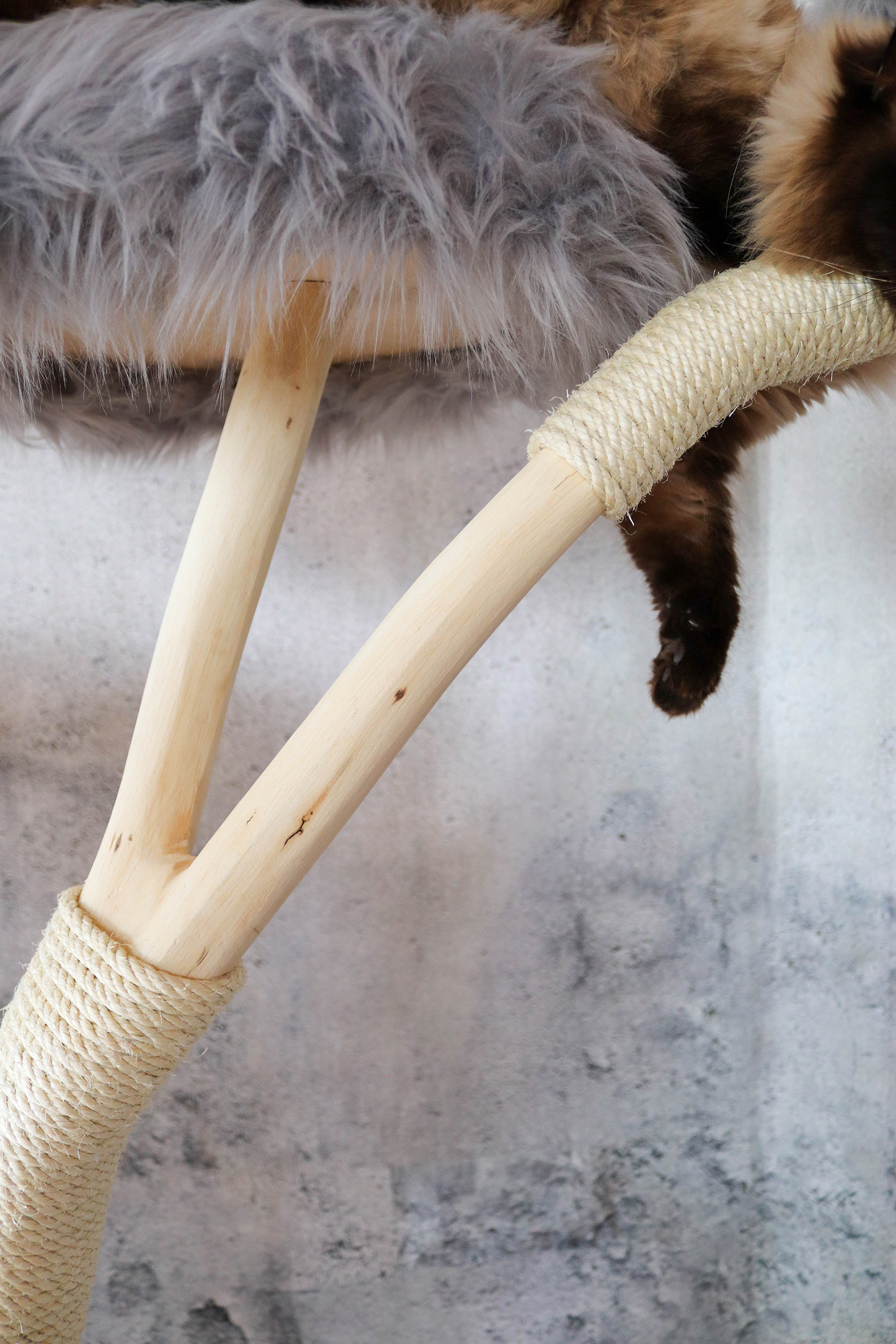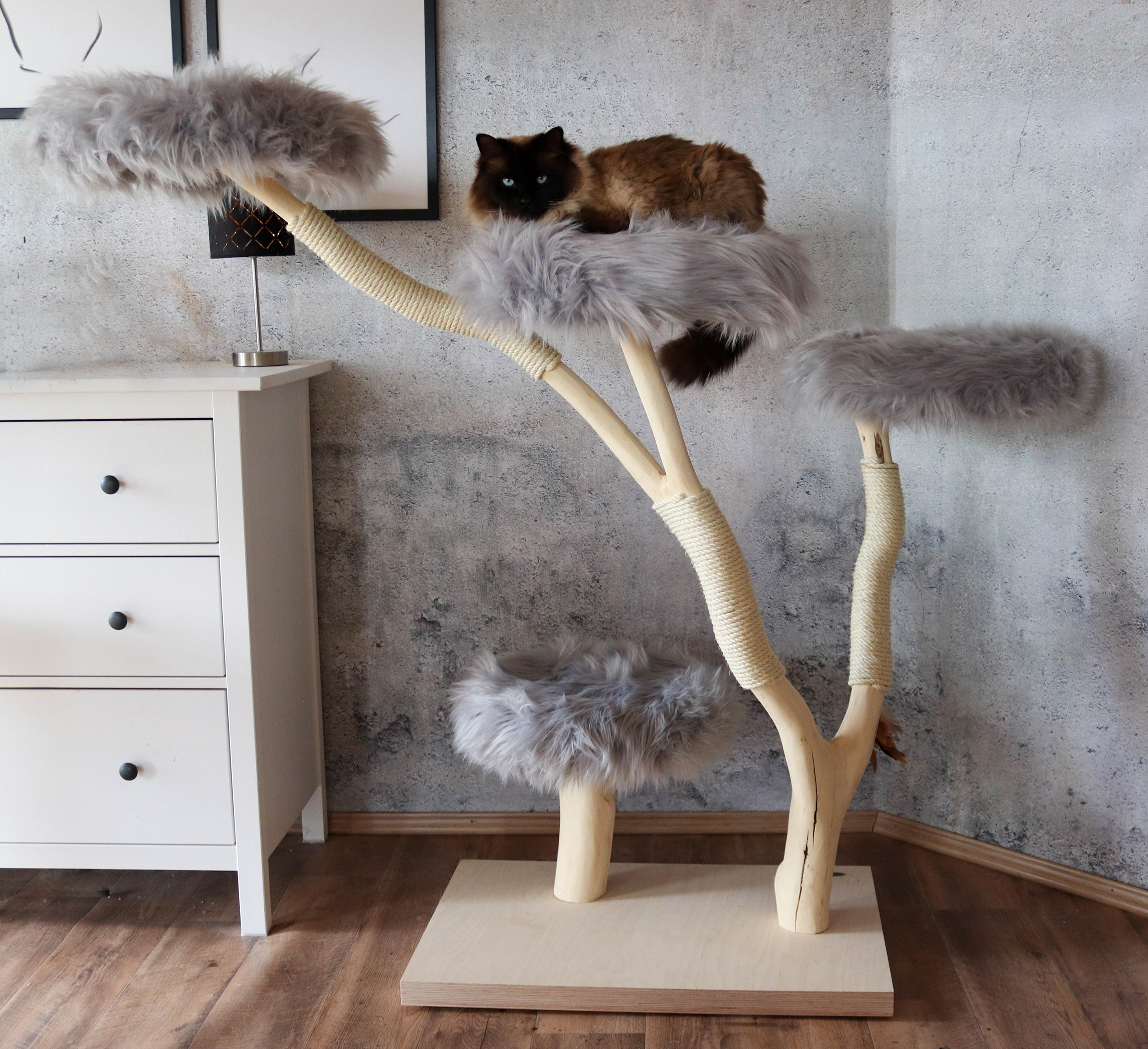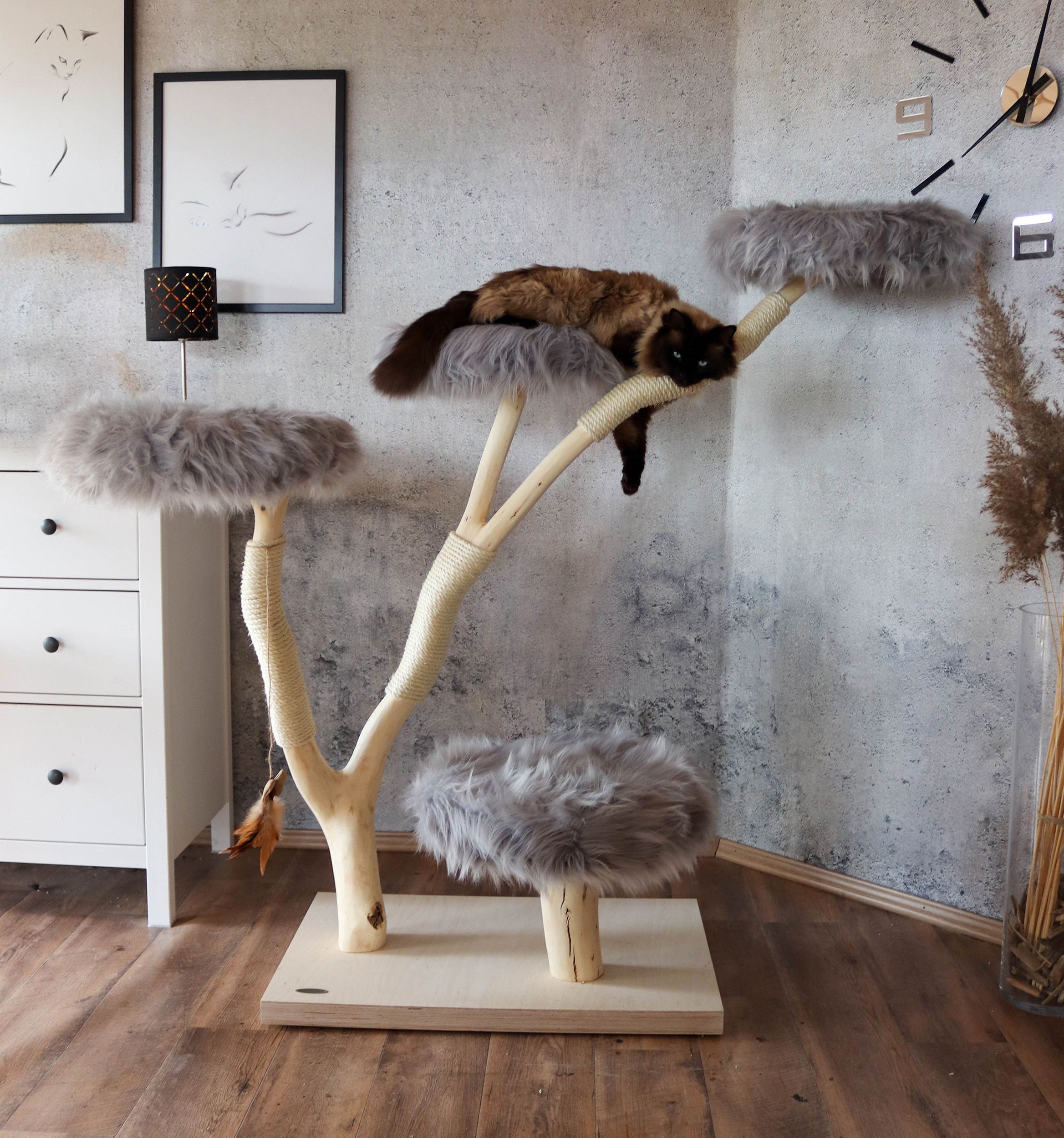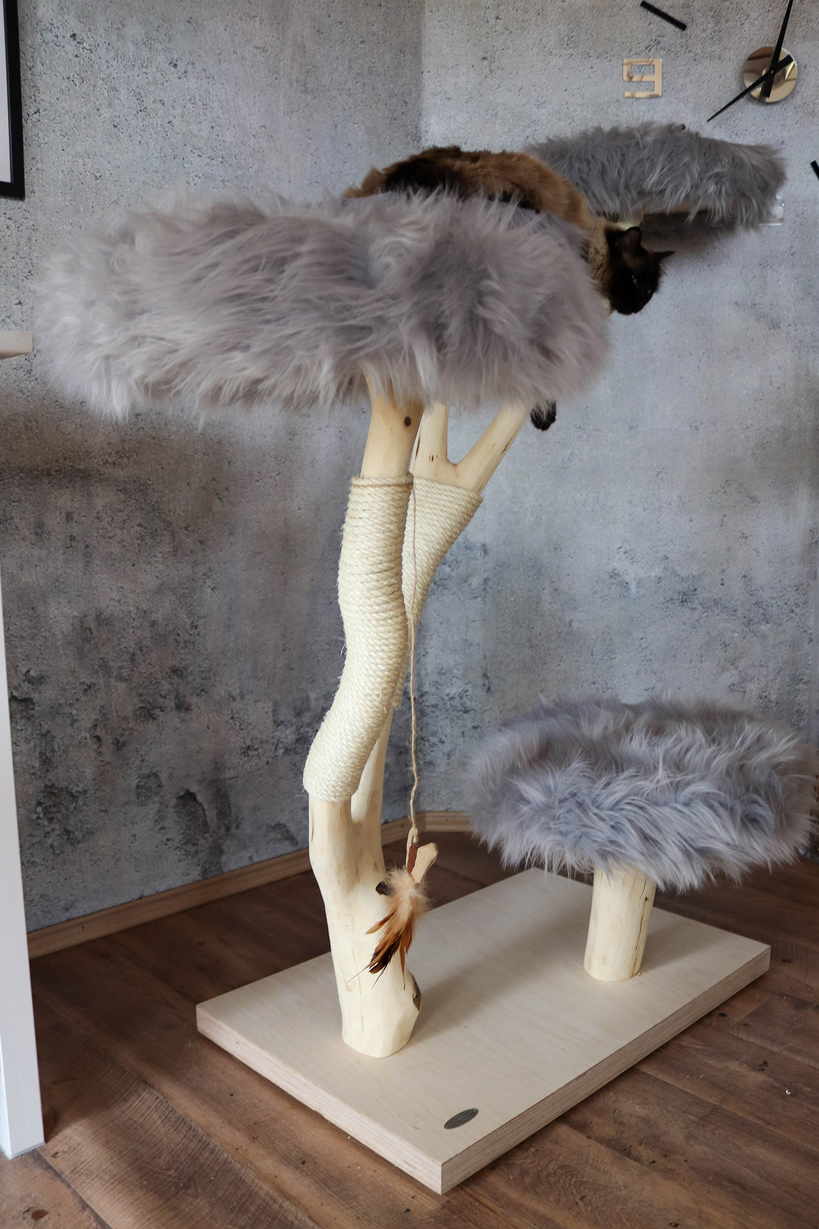 Die kurze Antwort ist: ganz nach Ihrem Geschmack! Jeder Naturkratzbaum ist ein Einzelstück und kann an Ihren individuellen Bedarf angepasst werden. Die Höhe des Naturkratzbaumes beträgt 135 cm. Der Buchenstamm ist naturbelassen, kann aber auf Wunsch auch lasiert oder geölt werden. So wird die Maserung des Holzes noch stärker hervorgehoben. Katzen lieben es, zu kratzen und ihre Krallen zu wetzen. Deshalb ist der Stamm des Kratzbaumes mit drei Sisal-Kratzstellen versehen. Sisal ist nicht nur sehr robust, sondern auch frei von Schadstoffen und damit ideal für Ihren Naturkratzbaum.
