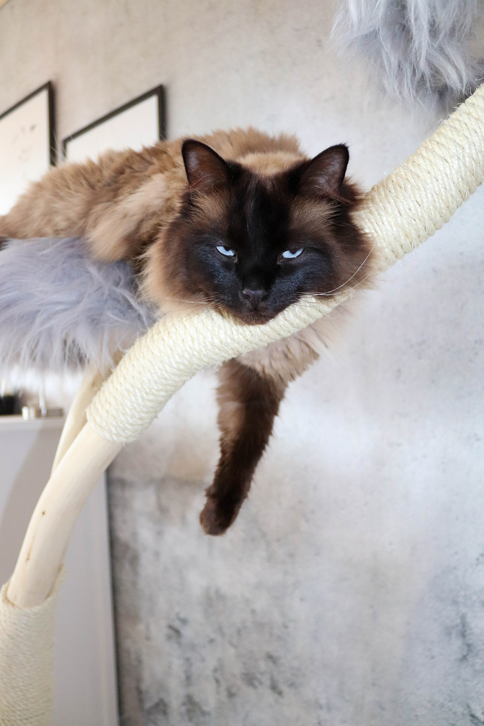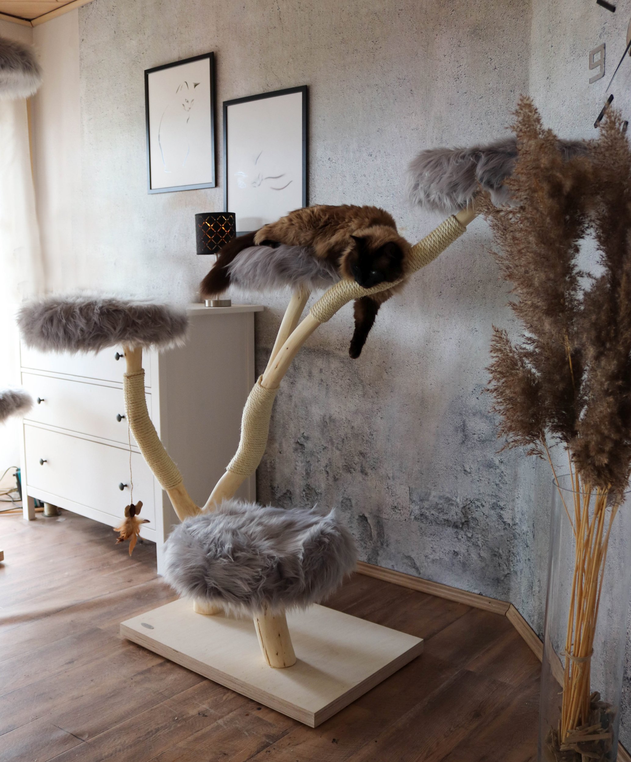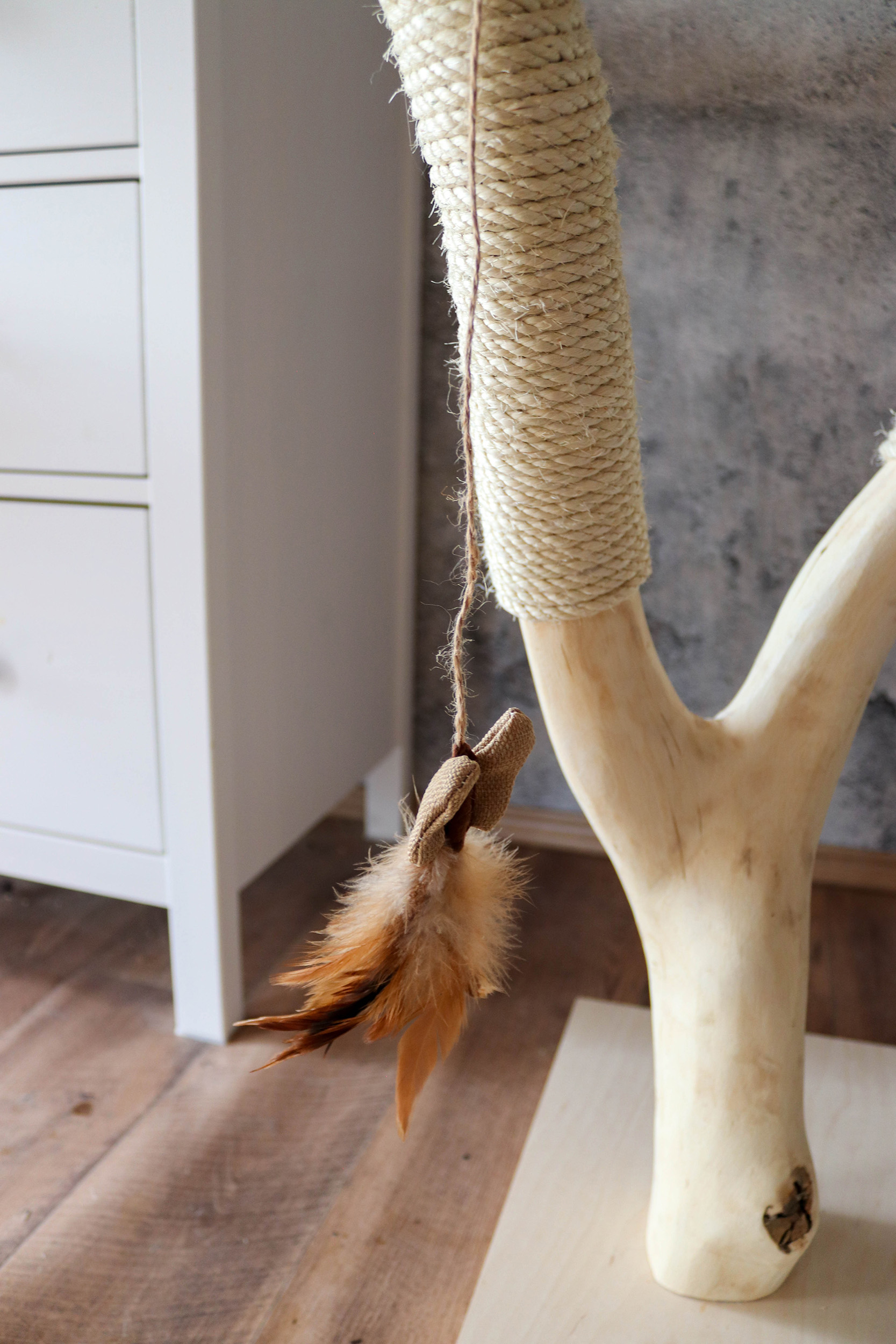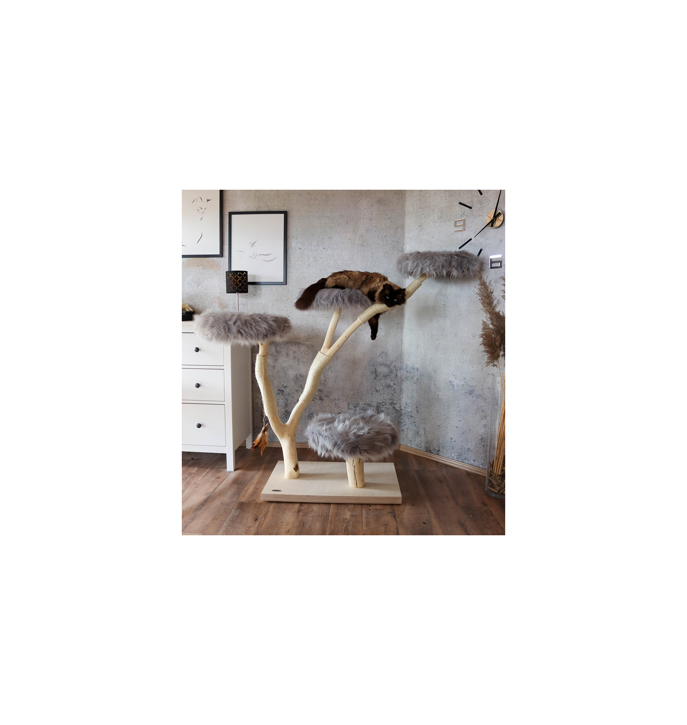 Hinweis: Da es sich bei jedem Kratzbaum um ein Naturprodukt handelt, kann das Holz in der Färbung variieren und mit der Zeit Trockenrisse aufweisen – was jedoch völlig normal ist und die Funktionalität des Naturkratzbaumes nicht beeinträchtigt.