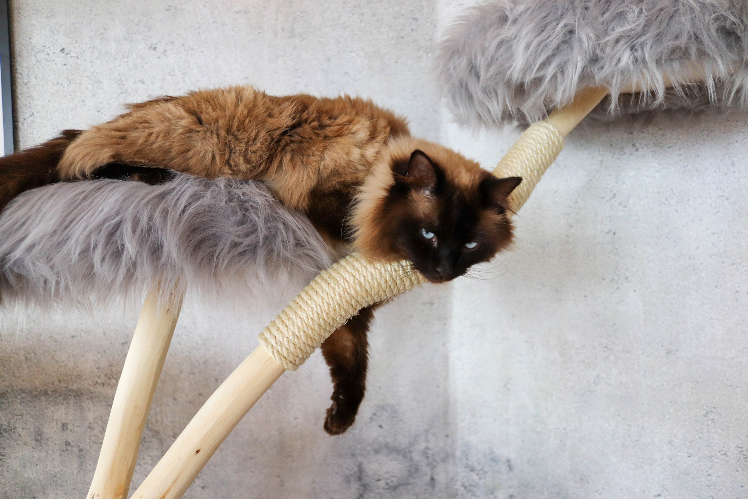 Katzen wollen jedoch nicht nur spielen, toben und kratzen, sondern auch relaxen. Generell bringen Stubentiger einen Großteil des Tages mit Schlummern zu, weshalb wir es uns zur Aufgabe gemacht haben, die Liegeplätze auf dem Kratzbaum so kuschlig und bequem wie möglich zu fertigen. Ob in luftiger Höhe oder ganz bodennah: Die Liegeflächen sind mit 3 cm dicken Schaumstoffpolstern versehen. Das darüber liegende hochwertige Kunstfell bietet ein weiches und angenehmes Liegegefühl. Keine Sorge: Die Kunstfelle lassen sich problemlos abnehmen und reinigen.