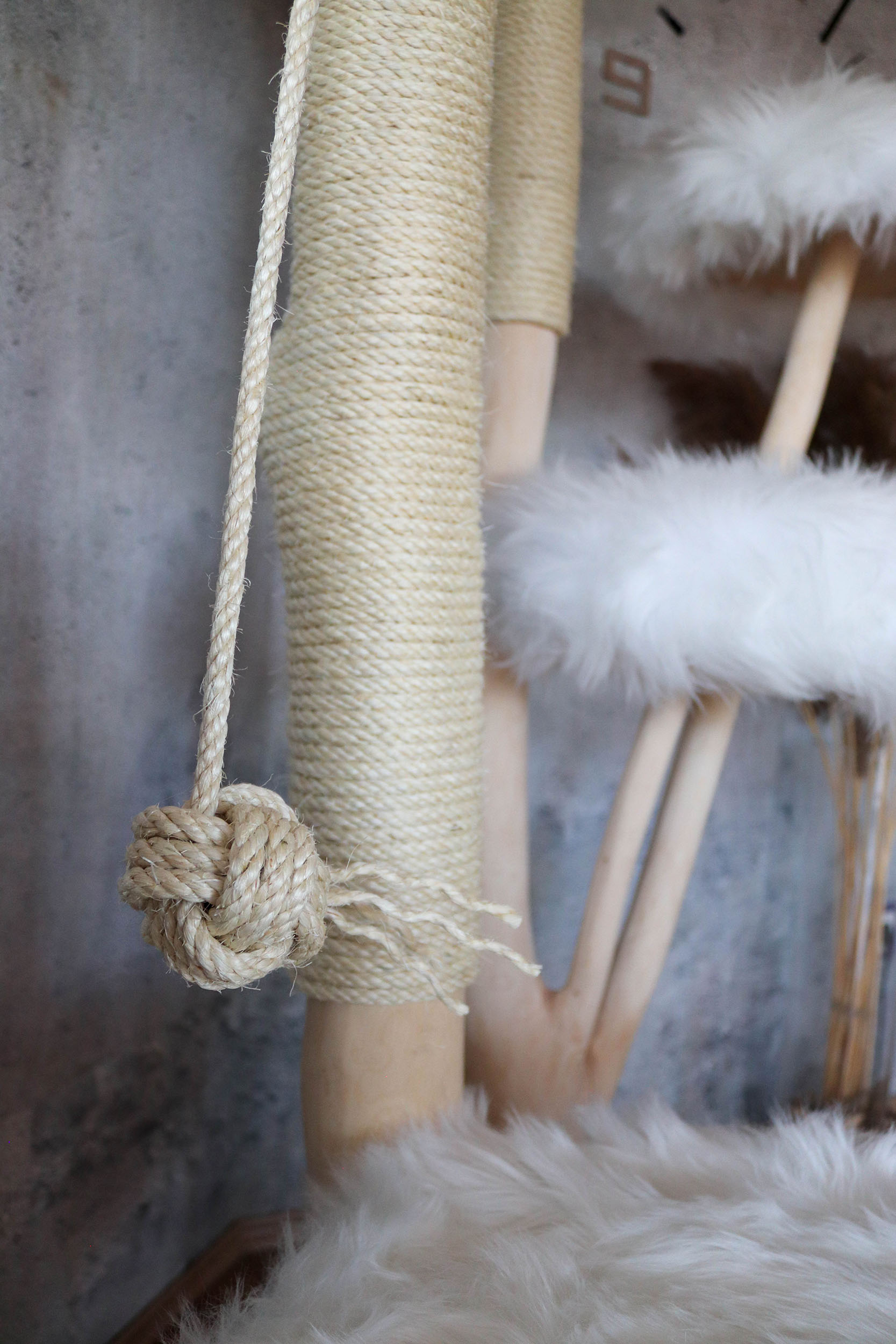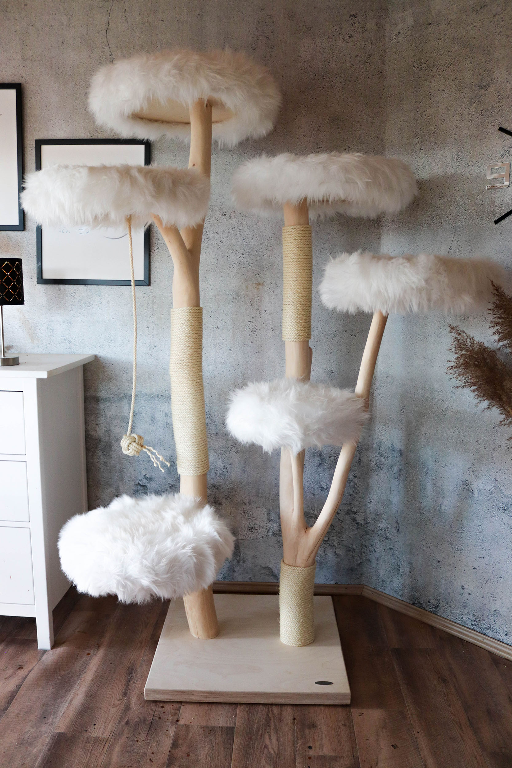 Hinweis: Da es sich bei jedem Kratzbaum um ein Naturprodukt handelt, kann das Holz in der Färbung variieren und mit der Zeit Trockenrisse aufweisen – was jedoch völlig normal ist und die Funktionalität des Naturkratzbaumes nicht beeinträchtigt.