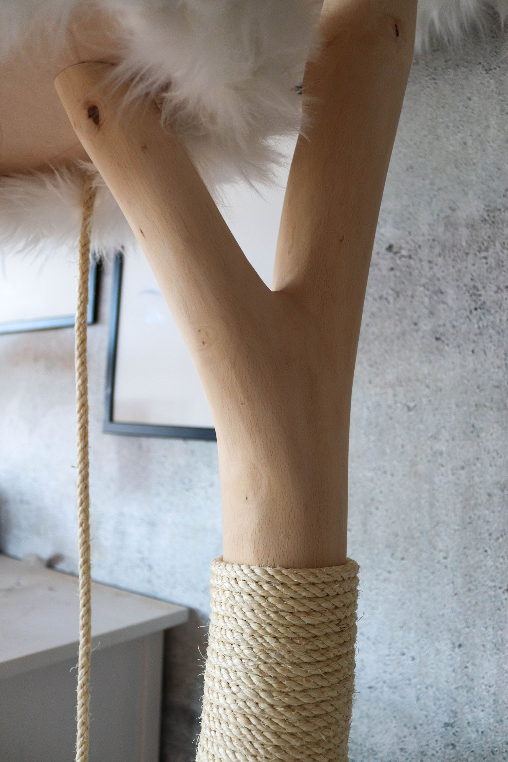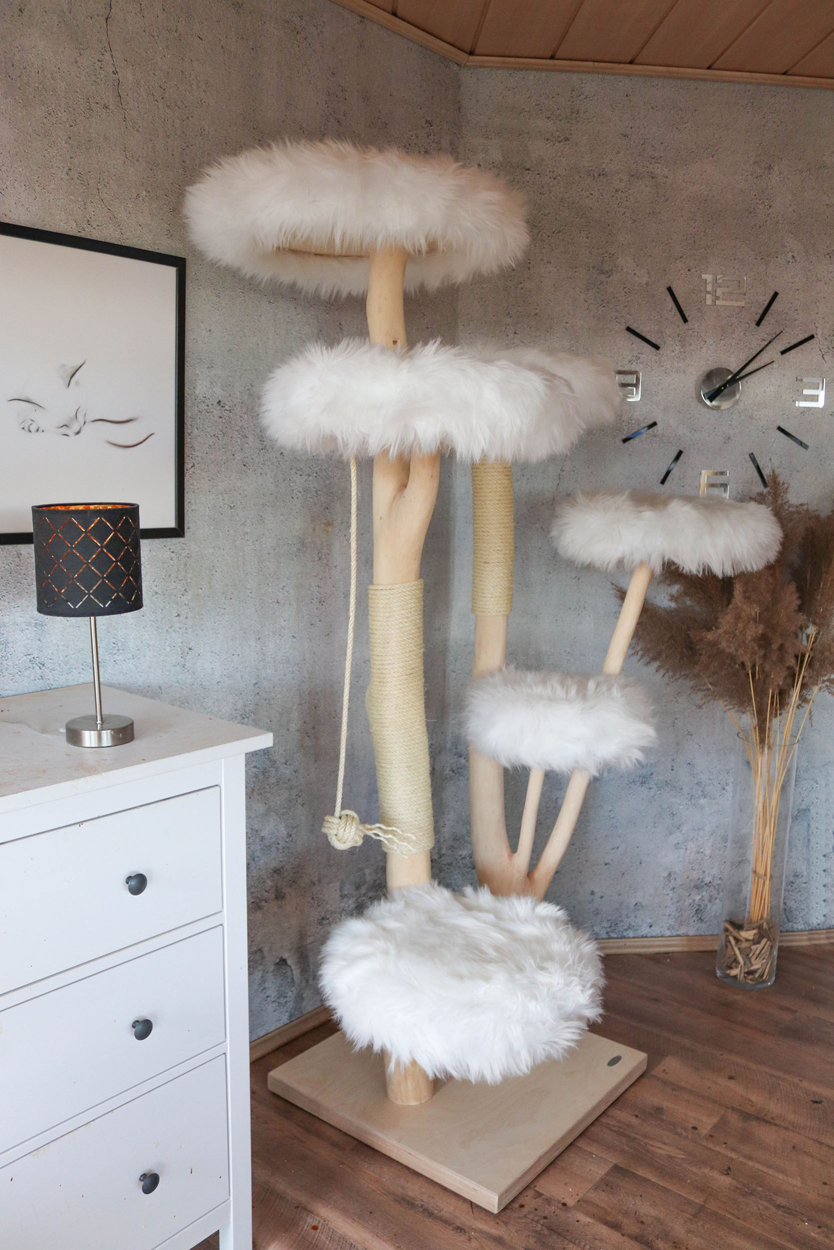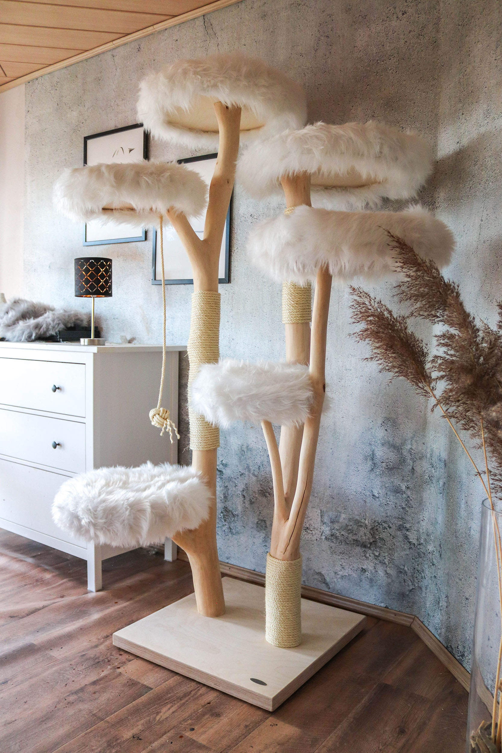 Die kurze Antwort ist: ganz nach Ihrem Geschmack! Jeder Naturkratzbaum ist ein Einzelstück und kann an Ihren individuellen Bedarf angepasst werden. Die Höhe des Naturkratzbaumes beträgt 185 cm. Der Buchenstamm ist naturbelassen, kann aber auf Wunsch auch lasiert oder geölt werden. So wird die Maserung des Holzes noch stärker hervorgehoben. Katzen lieben es, zu kratzen und ihre Krallen zu wetzen. Deshalb ist der Stamm des Kratzbaumes mit drei Sisal-Kratzstellen versehen. Sisal ist nicht nur sehr robust, sondern auch frei von Schadstoffen und damit ideal für Ihren Naturkratzbaum.
