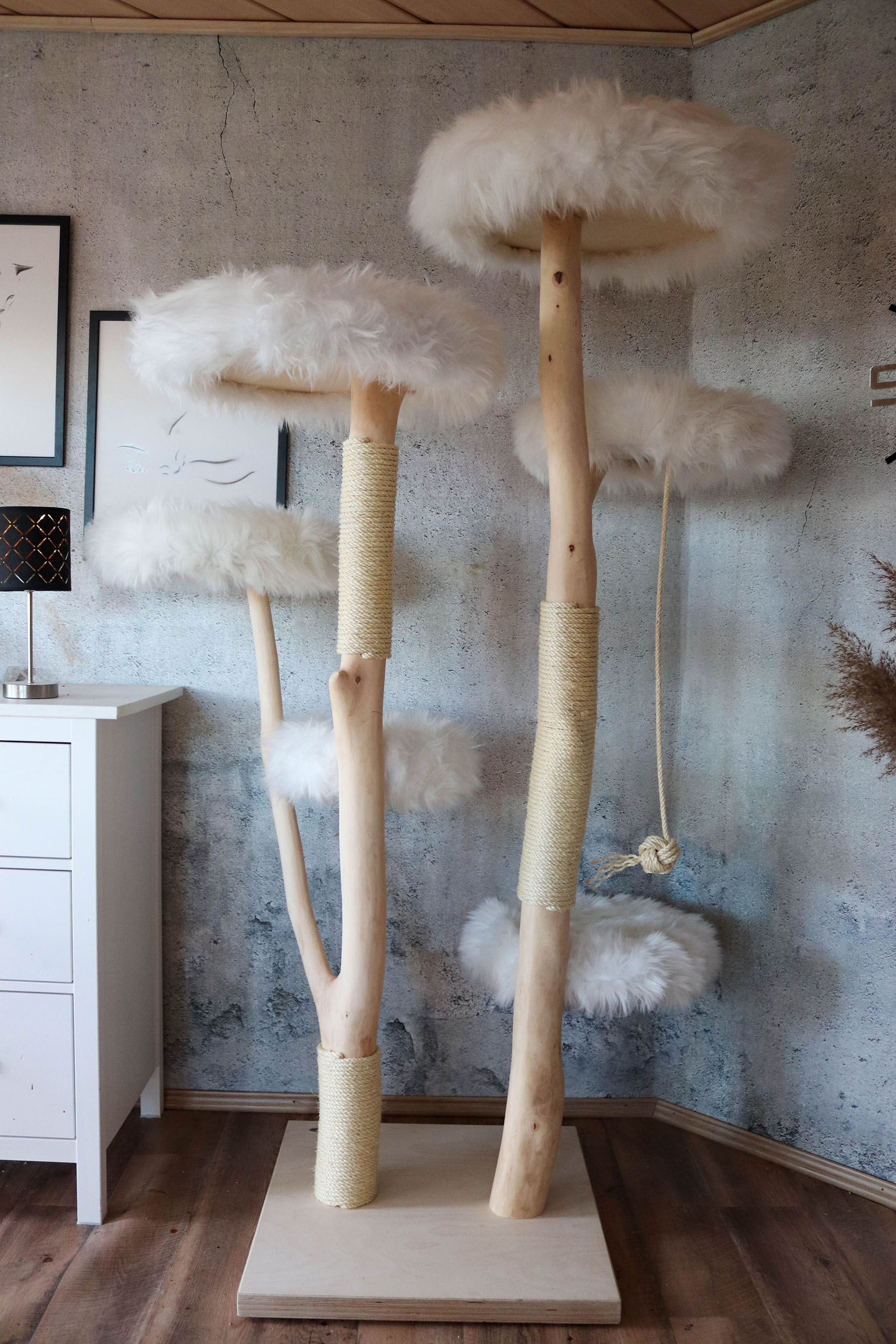 Jeder von uns gefertigte Naturkratzbaum ist ein Unikat, Ihr Kratzbaum-Wunsch ist also von großer Bedeutung. Sollten Sie extra Sisalkratzstellen am Naturkratzbaum wünschen oder Kunstfelle in anderer Ausführung oder Farbe, wählen Sie diese bitte bei der Bestellung im Konfigurator einfach aus, oder schreiben uns Ihre Wünsche.