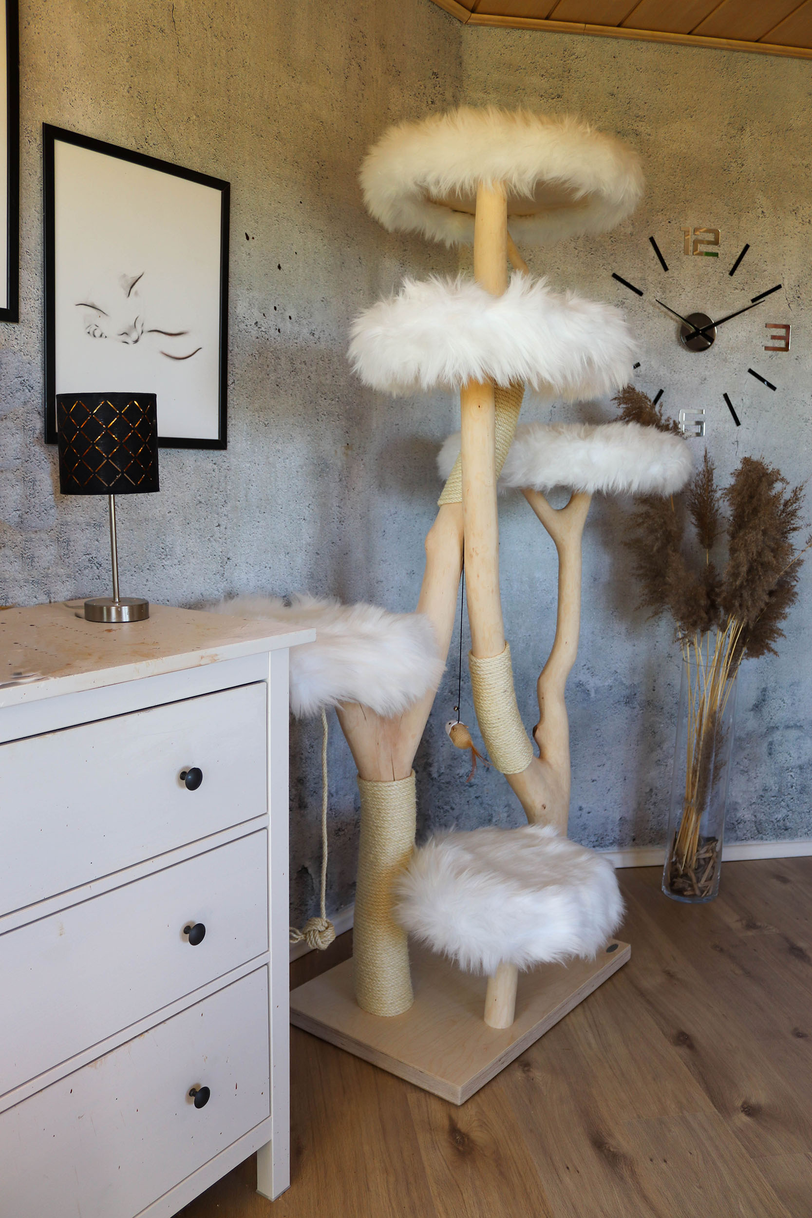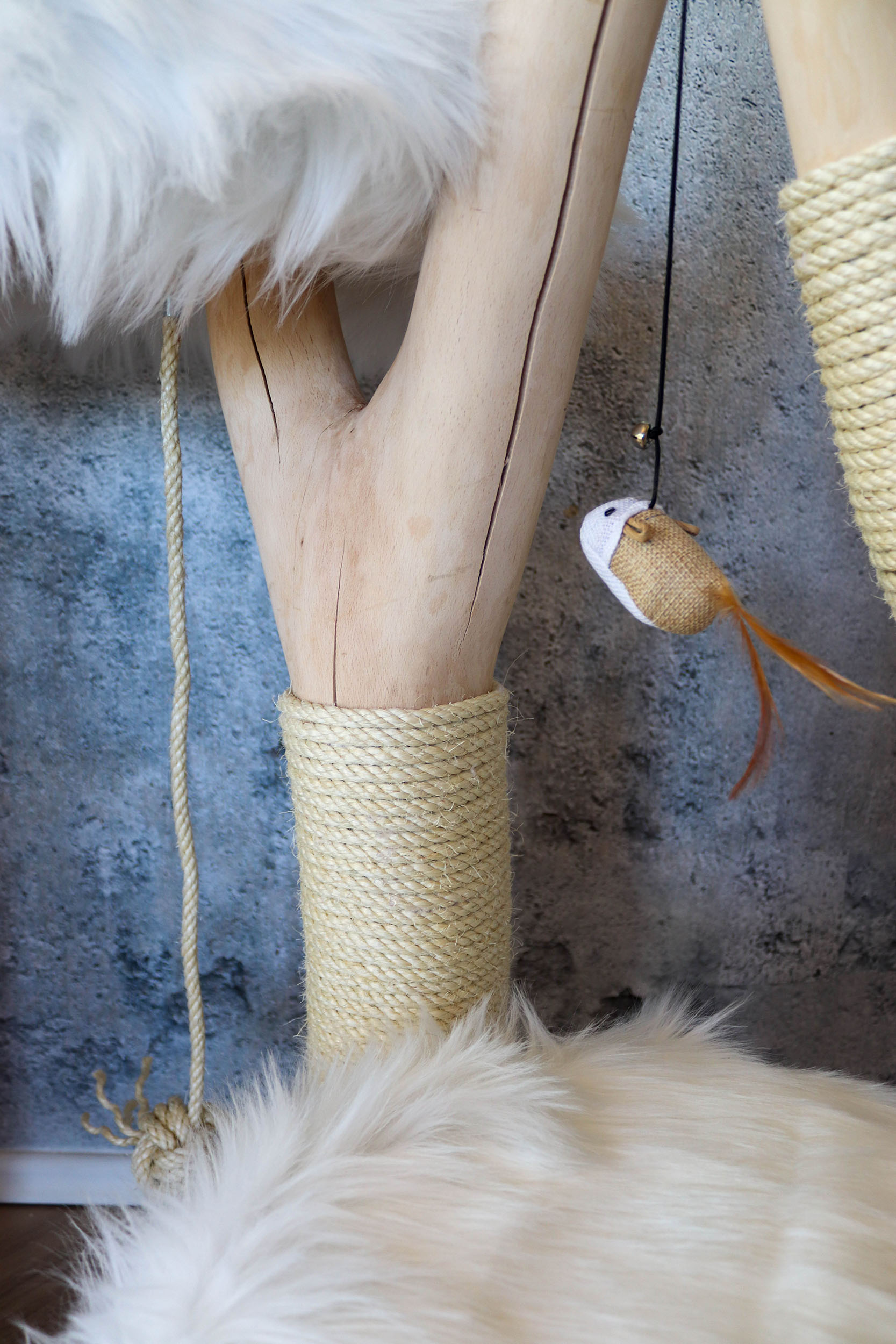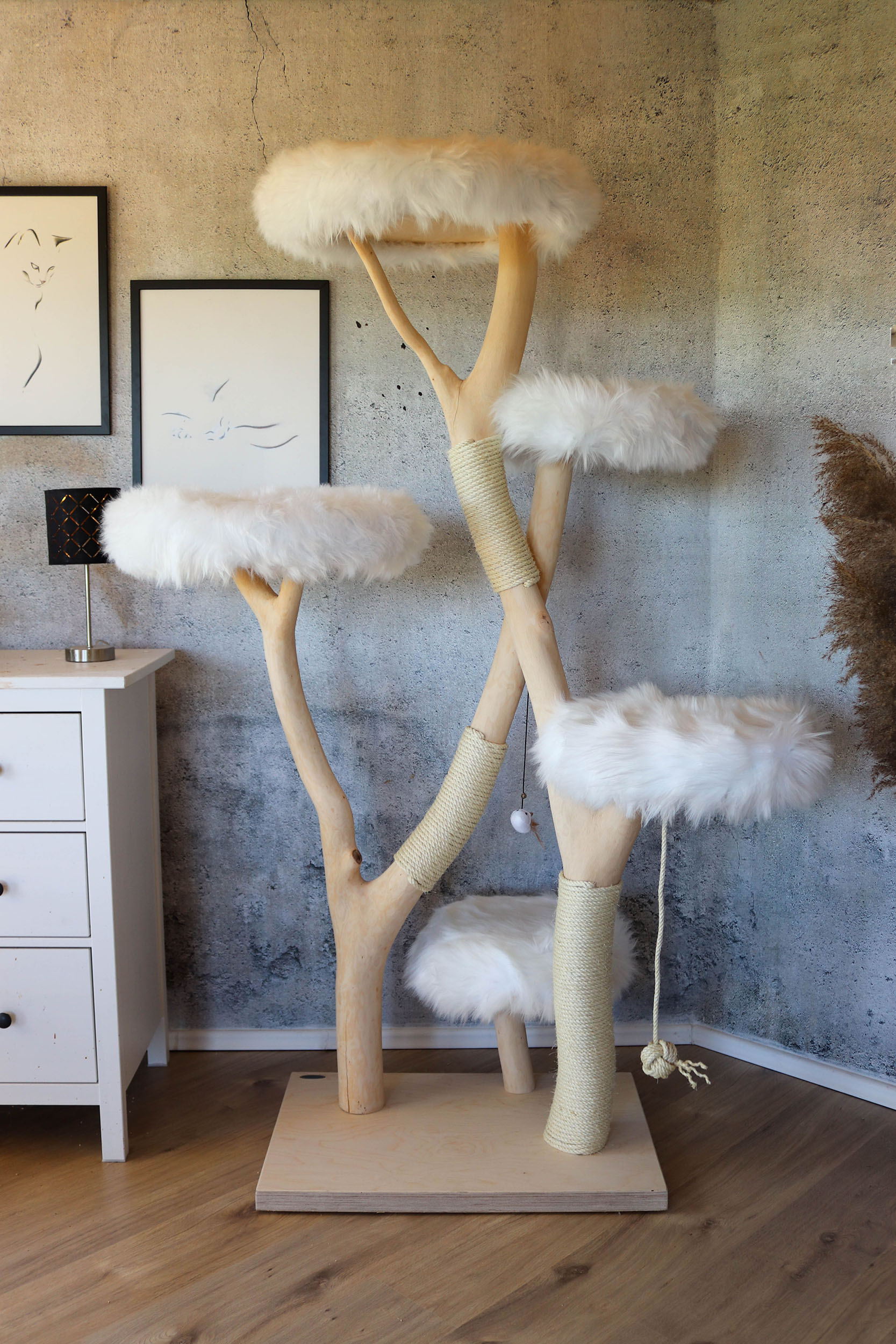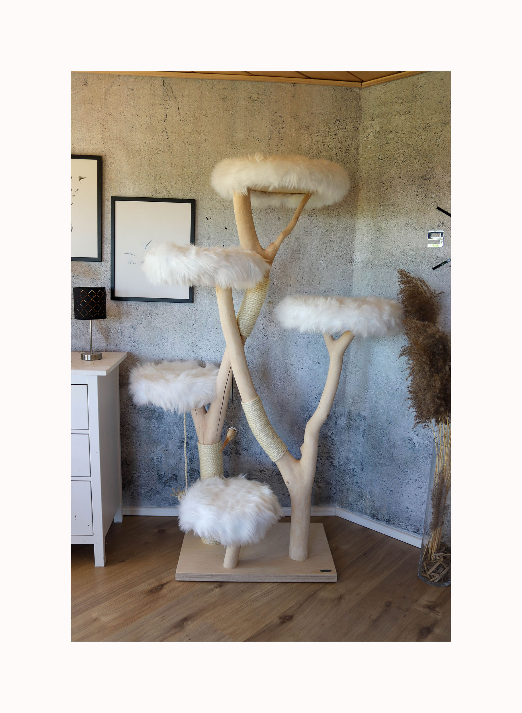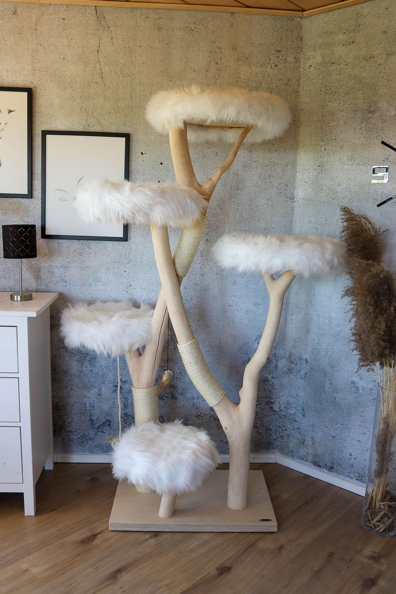 Hinweis: Da es sich bei jedem Kratzbaum um ein Naturprodukt handelt, kann das Holz in der Färbung variieren und mit der Zeit Trockenrisse aufweisen – was jedoch völlig normal ist und die Funktionalität des Naturkratzbaumes nicht beeinträchtigt.