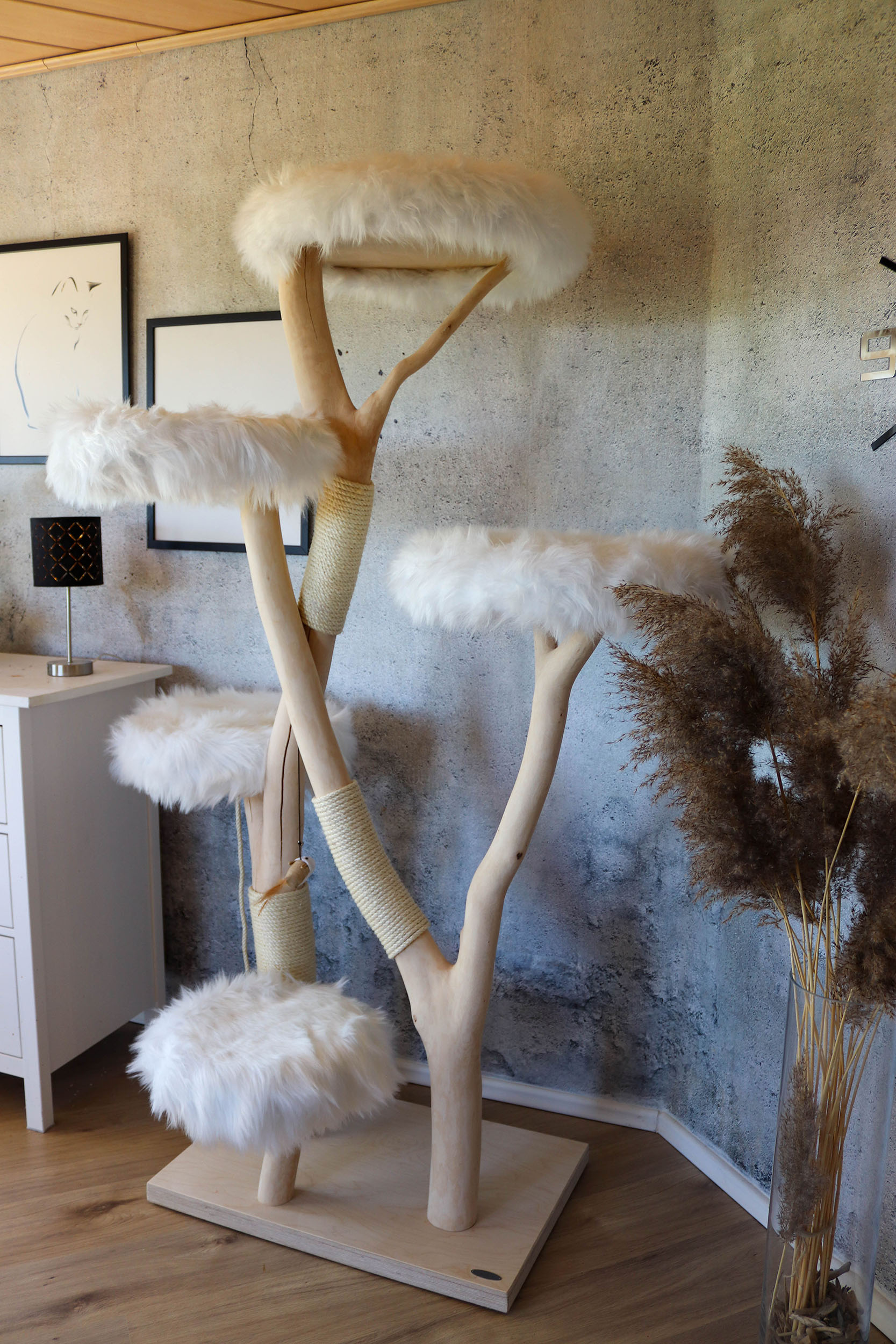 Die kurze Antwort ist: ganz nach Ihrem Geschmack! Jeder Naturkratzbaum ist ein Einzelstück und kann an Ihren individuellen Bedarf angepasst werden. Die Höhe des Naturkratzbaumes beträgt 183 cm. Der Buchenstamm ist naturbelassen, kann aber auf Wunsch auch lasiert oder geölt werden. So wird die Maserung des Holzes noch stärker hervorgehoben. Katzen lieben es, zu kratzen und ihre Krallen zu wetzen. Deshalb ist der Stamm des Kratzbaumes mit drei Sisal-Kratzstellen versehen. Sisal ist nicht nur sehr robust, sondern auch frei von Schadstoffen und damit ideal für Ihren Naturkratzbaum.