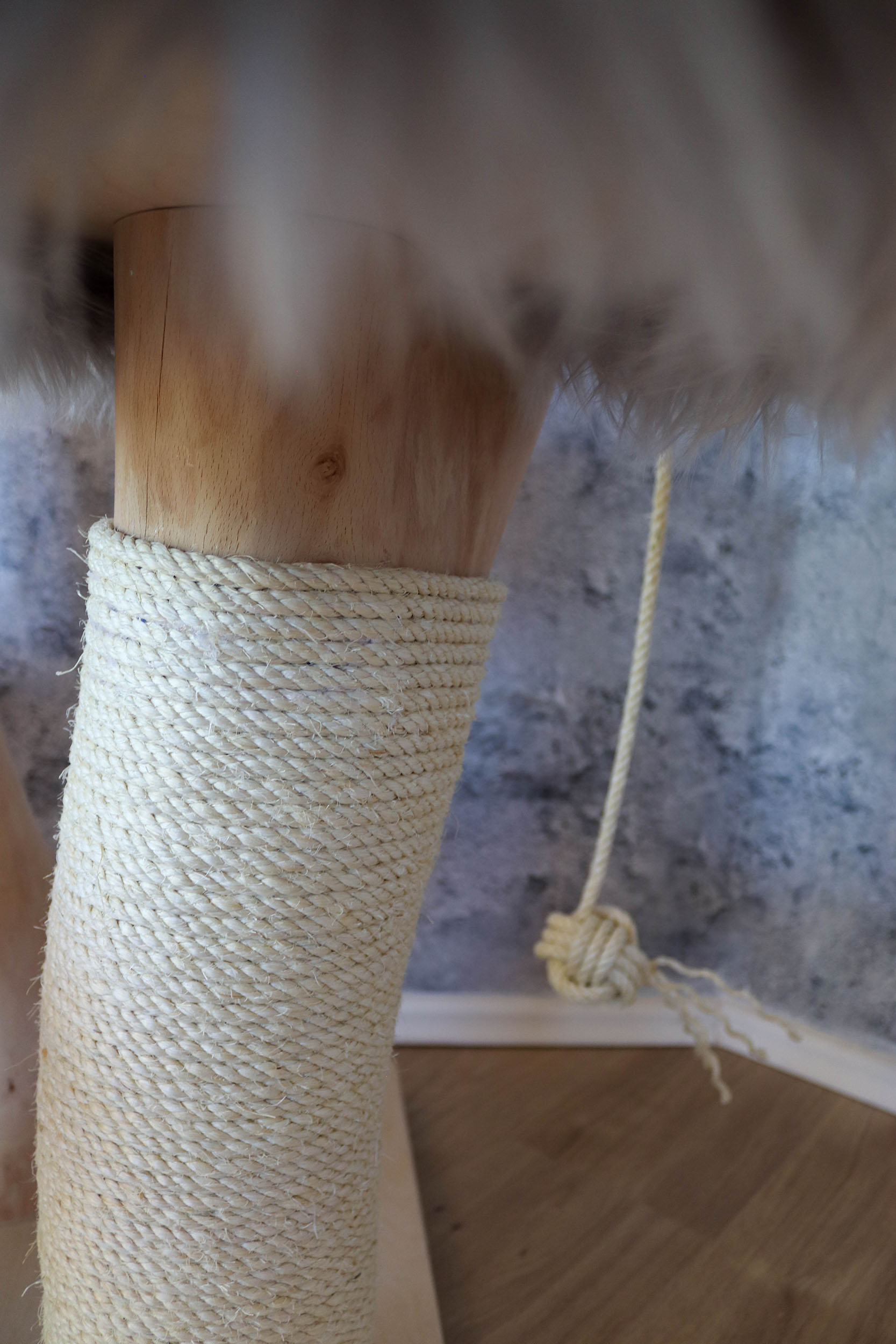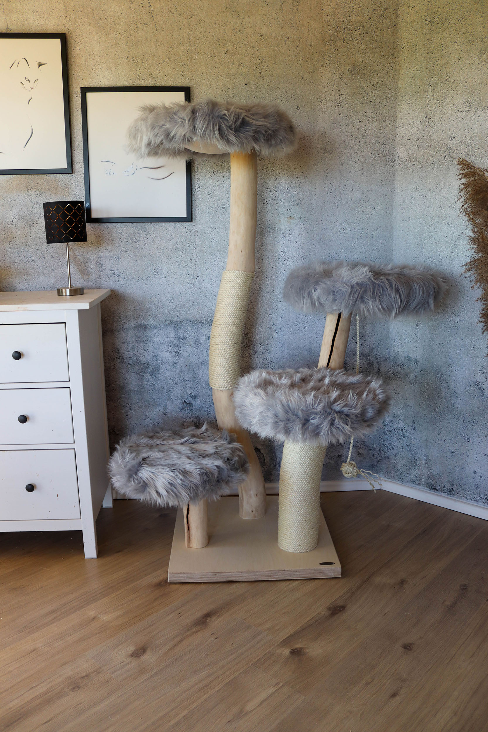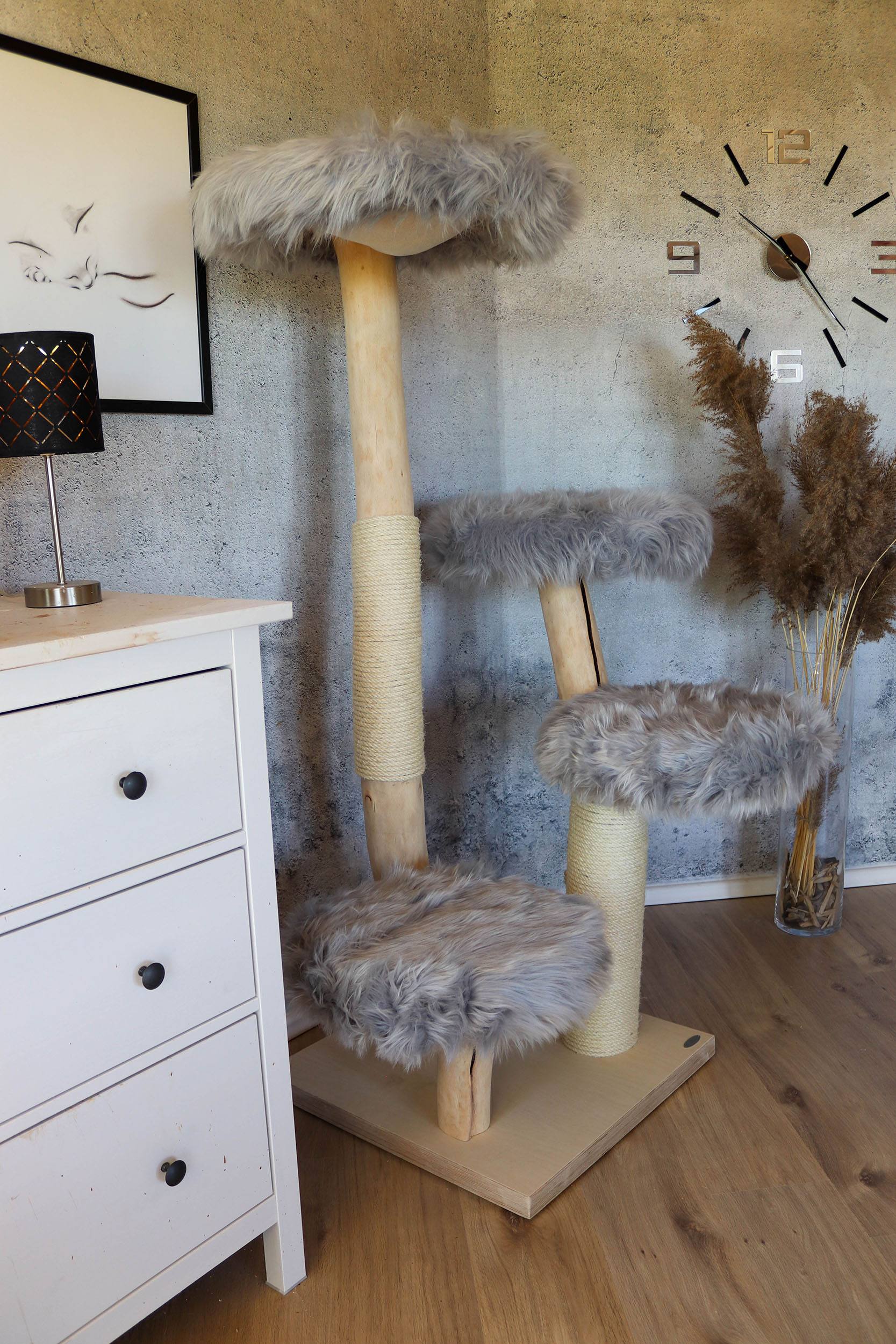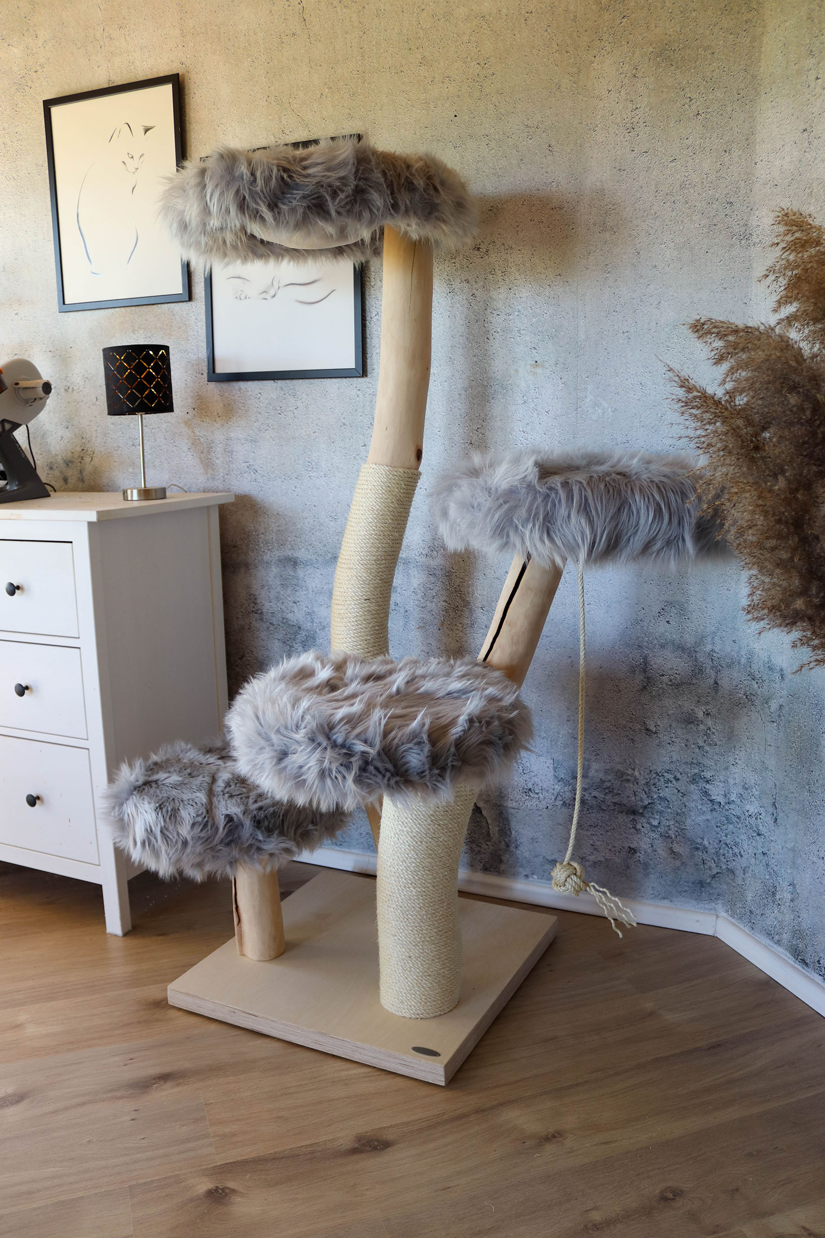 Hinweis: Da es sich bei jedem Kratzbaum um ein Naturprodukt handelt, kann das Holz in der Färbung variieren und mit der Zeit Trockenrisse aufweisen – was jedoch völlig normal ist und die Funktionalität des Naturkratzbaumes nicht beeinträchtigt.
