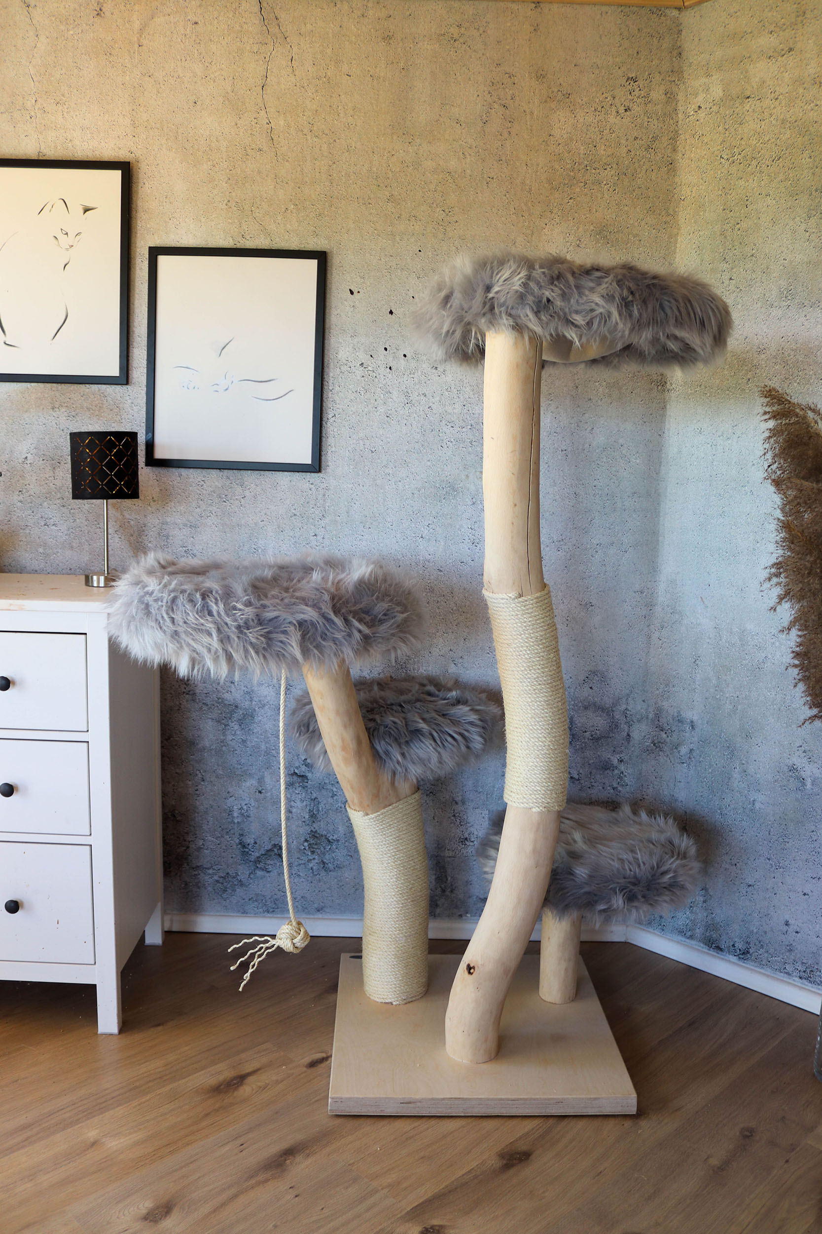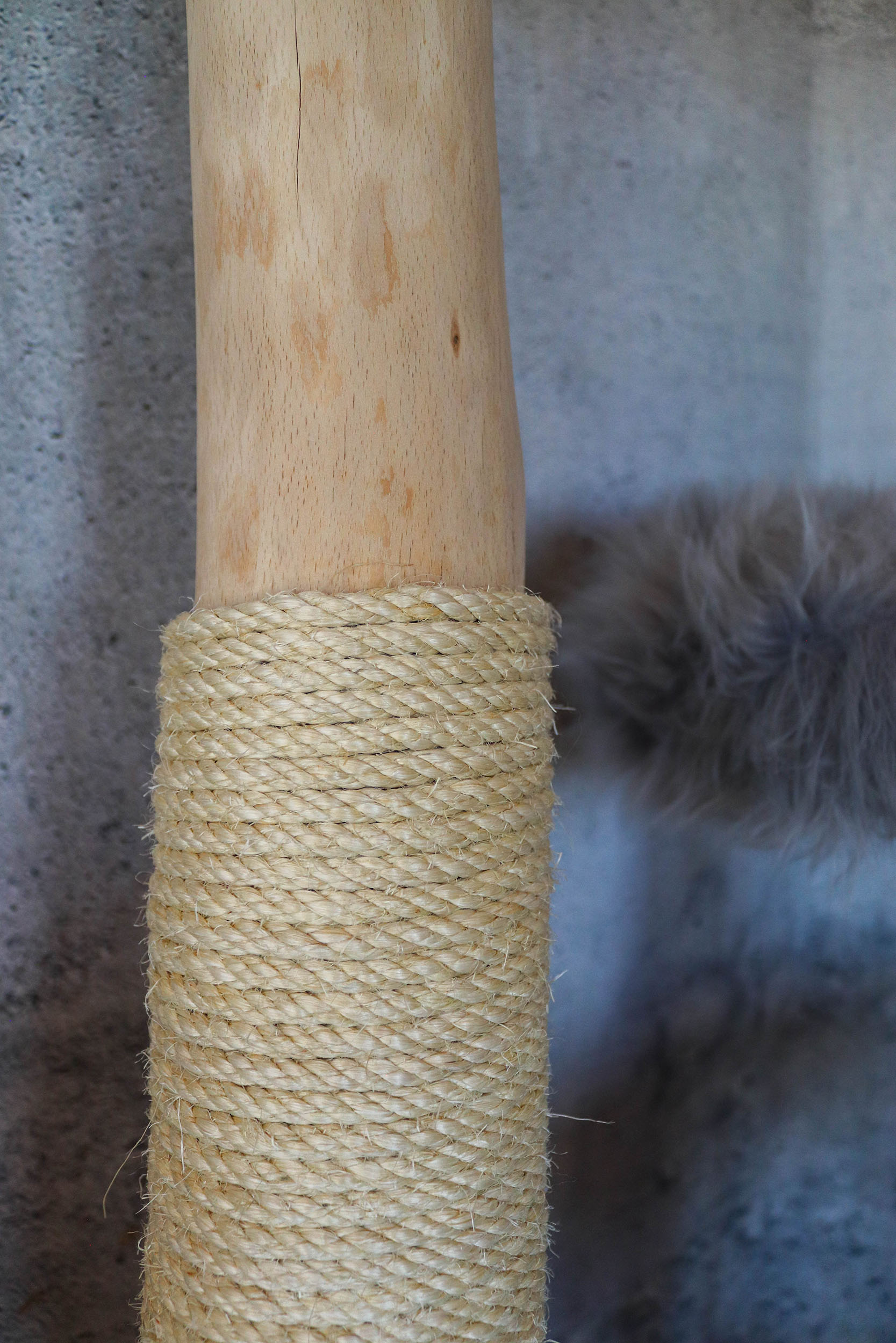Die kurze Antwort ist: ganz nach Ihrem Geschmack! Jeder Naturkratzbaum ist ein Einzelstück und kann an Ihren individuellen Bedarf angepasst werden. Die Höhe des Naturkratzbaumes beträgt 155 cm. Der Buchenstamm ist naturbelassen, kann aber auf Wunsch auch lasiert oder geölt werden. So wird die Maserung des Holzes noch stärker hervorgehoben. Katzen lieben es, zu kratzen und ihre Krallen zu wetzen. Deshalb ist der Stamm des Kratzbaumes mit zwei Sisal-Kratzstellen versehen. Sisal ist nicht nur sehr robust, sondern auch frei von Schadstoffen und damit ideal für Ihren Naturkratzbaum.